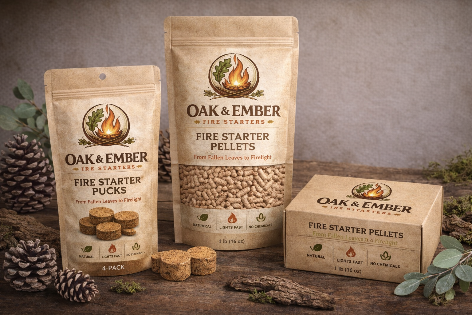We are a small business creating unique products from repurposed natural materials. All of our fire starters are made from the very fallen leafs you find in your yard. Our products are all natural, clean for the environment and have no chemicals.
